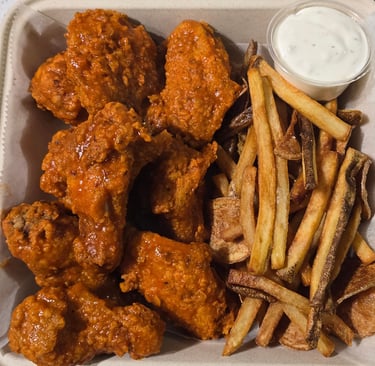 We serve fresh, JUMBO chicken wings. No lightweights here! Six Wings are approximately One pound per order, and are lightly breaded and tossed in our magic hot sauce.